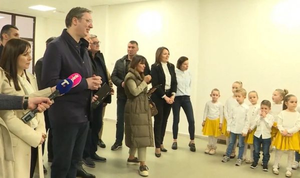Председник Републике Србије Александар Вучић стигао је у предшколску установу "Полетарац" у Руми, где ће присуствовати отварању новог објекта "Коцкица 2".